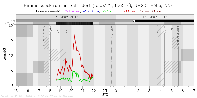 Die Polarlichtintensität ist die Differenz zwischen der Helligkeit der roten Polarlichtlinie (630 nm) und der diffusen Grundhelligkeit der Linie, die an diesem Datum und zum entsprechenden Sonnenstand zu erwarten ist.