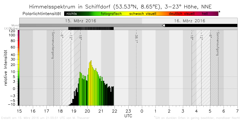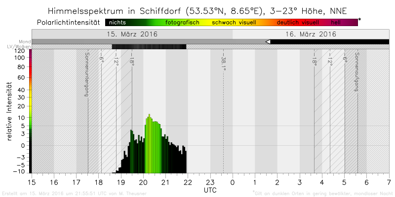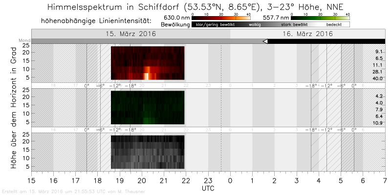 Der Wert wird für alle vom Spektrografen abgedeckten Höhen (ca. 3° bis 23°) gemittelt. Wenn Wolken die Sicht auf den Himmel verdecken, liegt die ermittelte Polarlichtintensität erheblich unter dem wahren Wert.